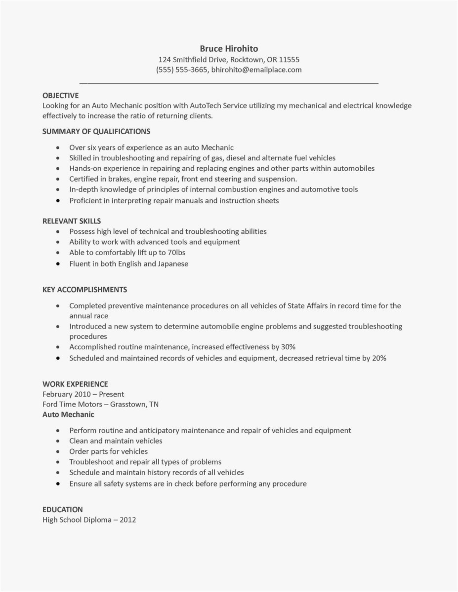 Mechanic Job Description Resume Luxury Writing A Concise Auto Technician Resume In 2020 Resume Objective Examples Resume Objective Resume Examples. Consider—there are 600 less auto tech jobs each year. Your automotive technician resume should get its points across at highway speed. Developed experience in inspection, maintainenace, or repair of any of the vehicle's systems, from the body to the engines. Write an engaging automotive technician resume using indeed's library of free resume examples and templates. Do it with an auto tech resume summary or resume objective, front and center. Automotive technicians usually need to highlight a few specific traits and abilities to win the attention of facility managers. Sales manager, tech, telco & auto resume examples & samples. Test drive vehicles to ensure quality. Find inspiration from 100+ professional auto tech resume examples & samples. Build the best auto tech resume and get hired! Customized samples based on the most contacted automotive technician resumes from over 100 million resumes on file. Tore down, repaired, and rebuilt defective parts including braking, coolant, and steering systems. Check out livecareer's professional automotive technician resume example to learn the best resume writing style. To secure an auto tech position in an exciting and dynamic company where will grow and maximize potential. Exceed sales, pricing and yield goals.