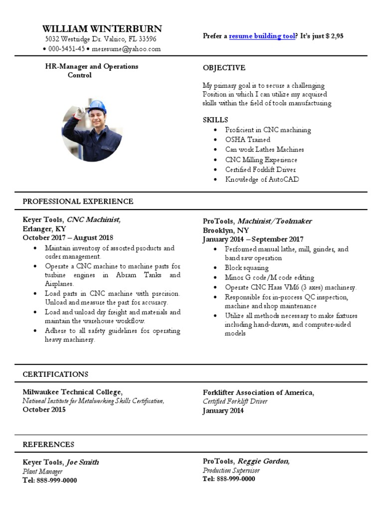 Cnc Machinist Resume Samples For Machine Operators Tips. Download sample resume templates in pdf, word formats. When writing your resume, be sure to reference the job description and highlight any skills, awards and. A cnc machinist resume has to show you're tech savvy, versed in lean principles, and have manufacturing street. Cnc machinist resume examples & samples. Cnc machinists operate cnc lathes and machines in manufacturing facilities. You need a compelling resume to succeed in your job hunt since the job market is overcrowded with cnc machinists applying for work. New jobs are added daily, so check back to find the next step in your career. Have strong understanding and knowledge of all equipment and machinery related to cnc tooling and maintenance. Browse 4,716 cnc machinist jobs to find the best match for you. Cnc machinist resume samples with headline, objective statement, description and skills examples. Writing a great cnc machinist resume is an important step in your job search journey. Apply to the best cnc machinist jobs today! Cnc machinists operate computer numerically controlled machine tools in order to create precision components. So you are a qualified cnc machinist seeking a new job? Looking for cnc machinist resume samples?