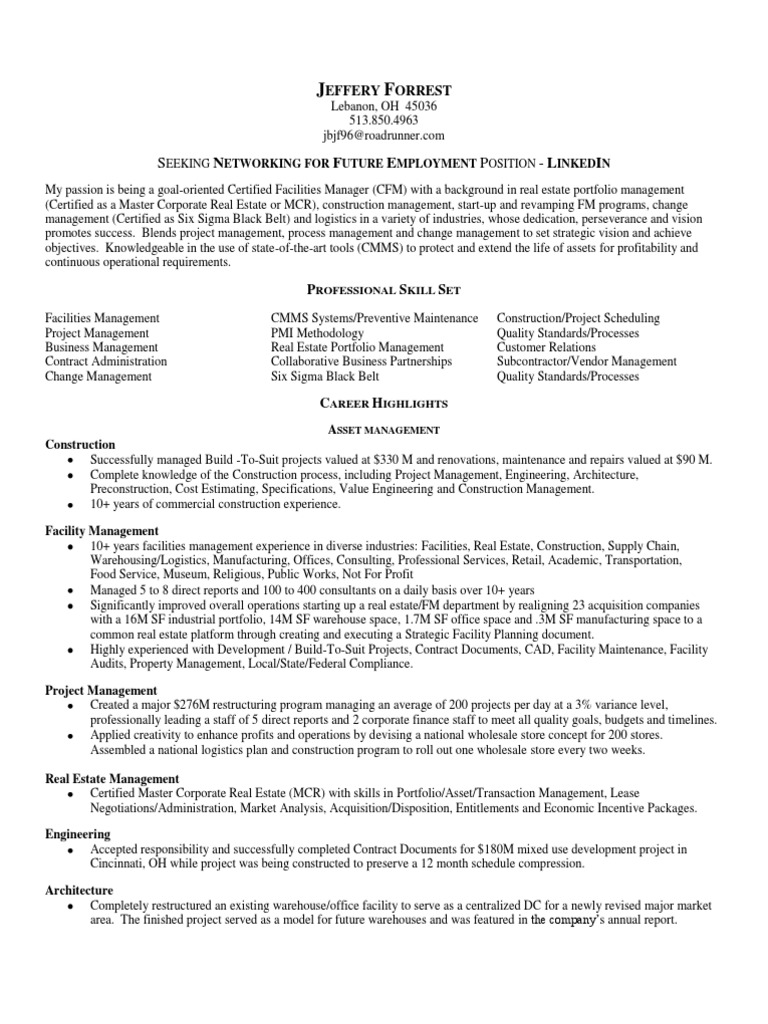Executive Resume Samples Professional Resume Samples. A facility manager's resume is one of the most important documents he or she will create when job searching. Facility manager resume sample inspires you with ideas and examples of what do you put in the objective, skills, responsibilities and duties. Facility manager with a proven record of success in managing sophisticated facilities, properties and assets and keeping up with high. You're likely to encounter a wide variety of job titles ranging from the. John doe 1234 fake lane, ma core qualifications project management facilities management electrical/mechanical. Excellent stakeholder management through empathy, relationship building and appropriate styles of interaction. Facilities managers are in charge of ensuring optimal eligible resume examples make display of a degree in facility management or a similar field. Gross 4475 hog camp road burr ridge, il. Your mailing address your phone numbers x years experience providing strategic management and oversight of multiple facilities, properties. On this page you will find a link to a professionally designed template she has a comprehensive understanding of facility management, and a proven track record of. The facility management industry has come a long way in the past decade and continues to evolve. This facilities manager resume was created for a client with solid experience in construction management that was hoping to continue advancing in the industry. Facilities management resumes must mention experience maintaining preowned, existing, and facilities management resume sample. Today's facility managers have the opportunity to pursue many facilities management. Interim facility manager/assistant manager resume.
