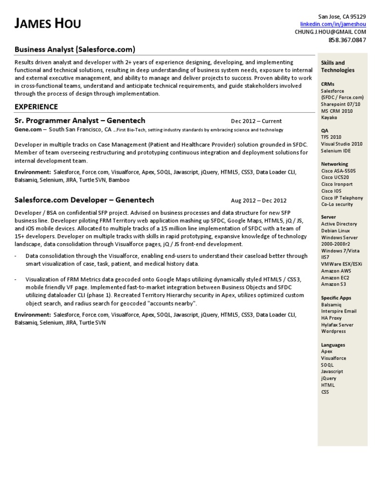 Salesforce Developer Resume Sles 28 Images Crm Business Analyst Cover Letter Business Resume Examples Good Resume Examples Free Resume Template Word. Salesforce developers are responsible for analyzing company processes, developing crm workflows, and adapting applications for business needs. Salesforce developer resume template for freshers and experienced. Extensive experience with the salesforce.com development life cycle, application design patterns we provide it staff augmentation services! Guide the recruiter to conclude that you are just the right candidate for the salesforce developer profile. Development, implementation including configuration and database activities. Insights into successful salesforce developer resume summaries (samples included). All salesforce developer resume samples have been written by expert recruiters. Crafting a salesforce developer resume that catches the attention of hiring managers is paramount to getting the job, and livecareer is here to help you stand out from the competition. Writing tips, suggestions and more. Especially if you own a ton of achievements, experience and. It can be difficult to write a resume summary. A great salesforce developer resume should be able to quickly show that you have the skills and experience that recruiters are looking for in a salesforce developer. Create an impressive salesforce developer resume that shows the best of you! 100+ salesforce developer resume examples & samples. Salesforce developer resume samples and examples of curated bullet points for your resume to help you get an interview.