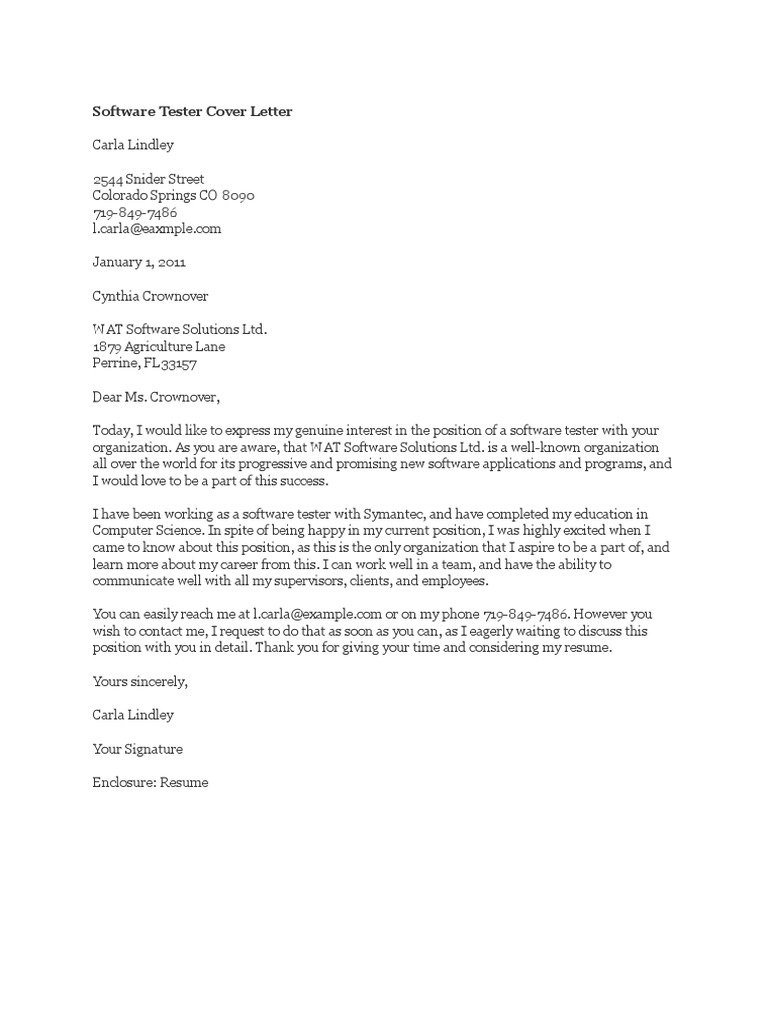Software Tester Cover Letter Free Sample For. A software tester cover letter is written by an applicant who has deep knowledge and understanding of computer programming. A software testing cover letter succinctly expresses your background and expertise assessing new software applications, improving, locating bugs and fixing them throughout all stages of development. Common software tester duties include running tests, gathering and analyzing test data, identifying bugs, and providing feedback to developers. Following (how long) working as a software engineer, i became more involved in the testing side so looking at software which had been written and testing it before people got to use it in real life and ensure that it did not. These professionals function independently as a contractor or can be employed by an organization. The cover letter examples below can give you a great idea what your software testing cover letter should look like. Resumes are usually a dry list such as, 'created test the same way you would write a cover letter for any other job! Don't send your resume without a cover letter. Find out how to create a professional cover letter in our guide. Software testers often don't do a good job of describing what they did and how they contributed. No matter what industry you are in or what career you are hoping to land, there are certain job search rules that will make your hunt easier. Cover letter tips for software testing. All what your software tester cover letter need to contain. A software testing cover letter is important because it highlights the applicant's skills, experience, and qualifications to be a suitable candidate for the position. It's not just necessary but really desirable to follow some standard rules of writing because this way will be much easier to read for recruiters or employers.