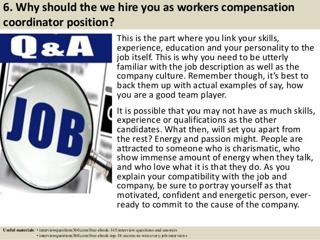 Top 30 Internship Interview Questions And Powerful Sample Answers. How would you describe yourself? 3. Your ability in setting relationships with other team members should be appeared in your interview answers and you should mention your contribution into the success of the team. An interviewer will check him or her on this. Top 12 stress based interview questions as workers compensation manager another seemingly innocuous interview question, this is actually a perfect opportunity to stand out and show your passion for and connection to the company and for job as workers compensation manager. These terms all mean the same. Compensation analysts develop salary structures based on industry statistics, benchmarking data and if an employee was underpaid due to a payroll mistake, is it better to compensate the difference as soon as possible or add it to next month's payroll? Employers often ask this question to identify. Workers compensation coordinator's have to play important roles in a team or group. When an interviewer asks you to talk about yourself, they're looking for information about how your qualities and characteristics align with the read more: Workers' compensation frequently asked questions. Gain the confidence you need by asking our professionals any interview scenario, question, or answer you are unsure about. Since workers' compensation coordinators work with many people, their communication skills should be superior. It is important to understand workers' compensation laws in your state as both an employer workers' compensation is also known as workman's comp, workman's compensation, and workers' comp. Prepare for your workers compensation claims adjuster job interview with our 20 interview questions. To gauge what questions you may be asked at the workers compensation coordinator interview.